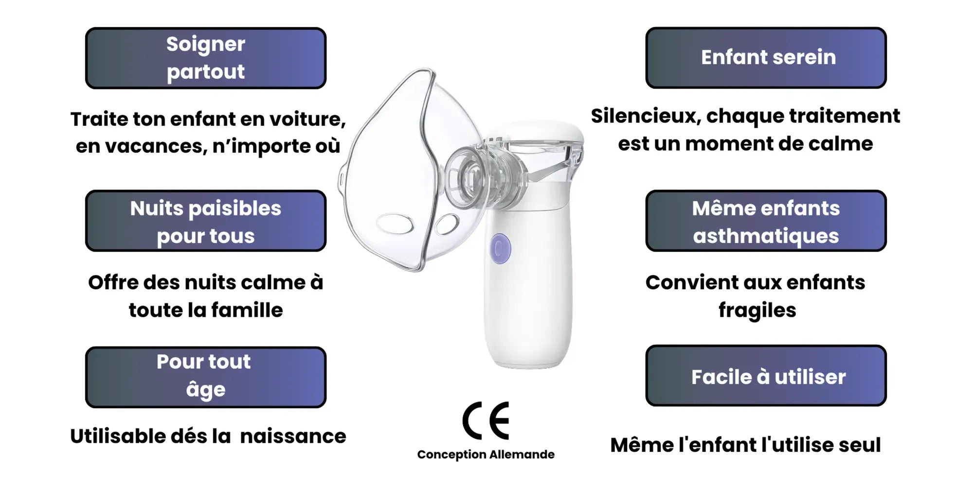 Absolument. Ce nébuliseur a été spécialement conçu pour offrir une nébulisation douce, silencieuse et efficace, parfaitement adaptée aux besoins des enfants asthmatiques.