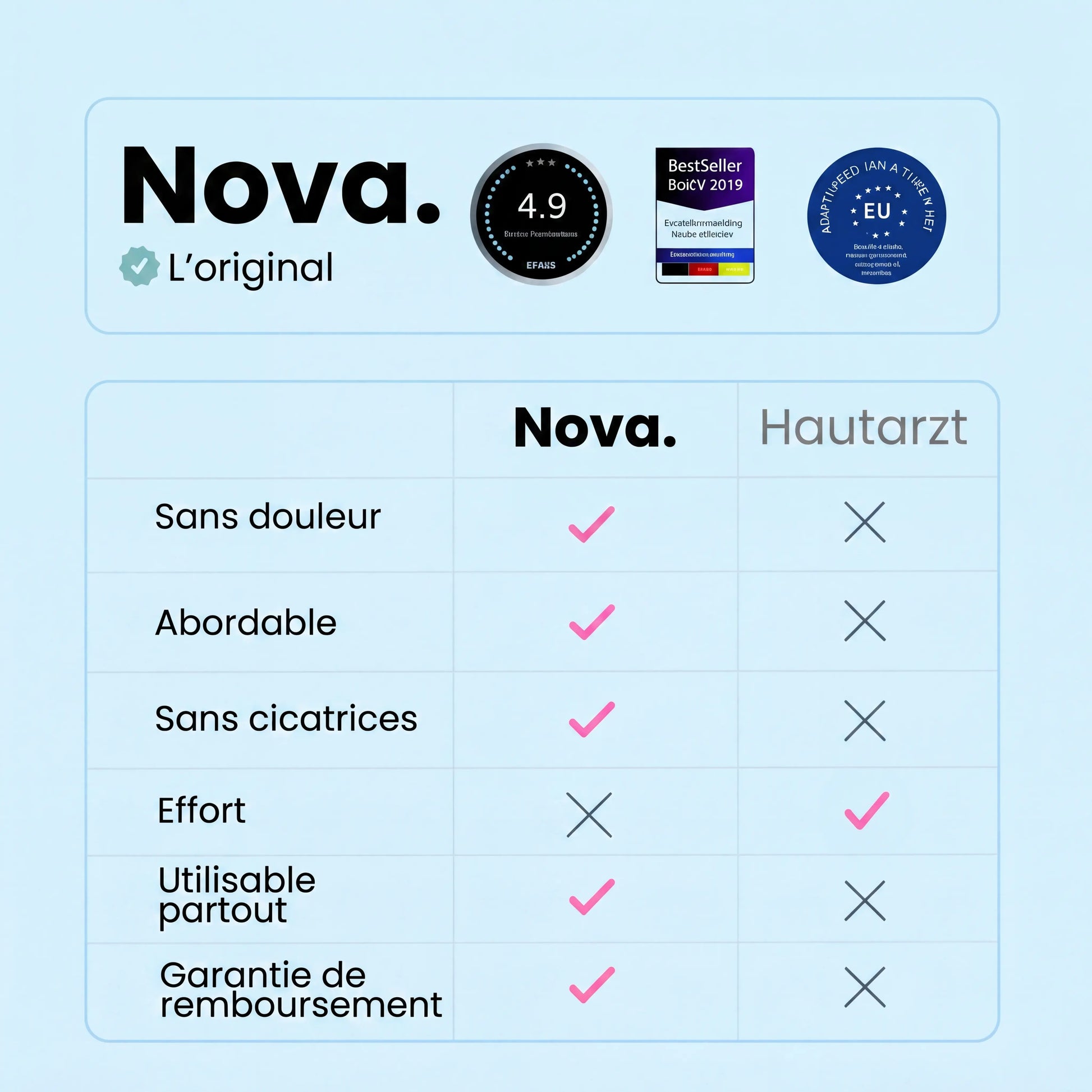 Tu n'es pas seul(e) – beaucoup abandonnent face aux remèdes maison, aux sprays ou aux visites chez le médecin coûteuses qui ne donnent rien. Avec Nova, ça prend enfin fin. Notre système inspiré de la médecine élimine les verrues doucement, en toute sécurité et sans cicatrices – facilement depuis chez toi. Pas de rendez-vous, pas de douleur, pas de risque.