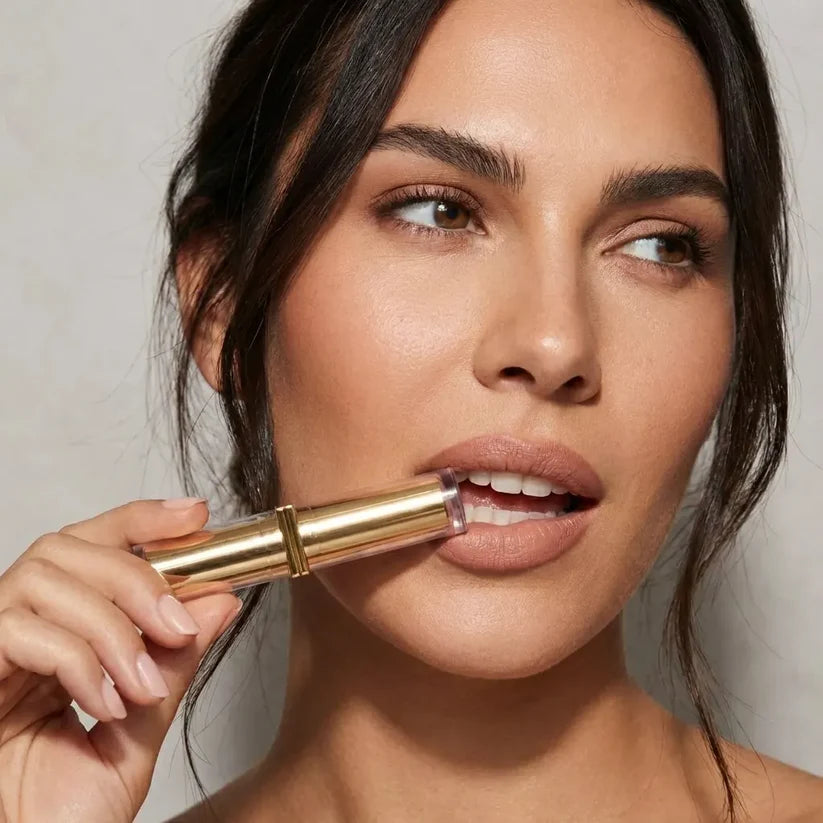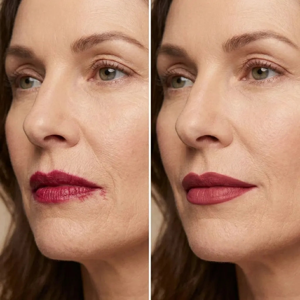 Après 50 ans, les lèvres perdent naturellement un peu de volume et de définition. C’est normal. Mais l’effet d’amincissement que vous voyez dans le miroir est souvent aggravé par le rouge à lèvres lui-même, qui dépasse la ligne des lèvres en quelques minutes, floute le contour et fait disparaître la définition qui donne leur forme aux lèvres.