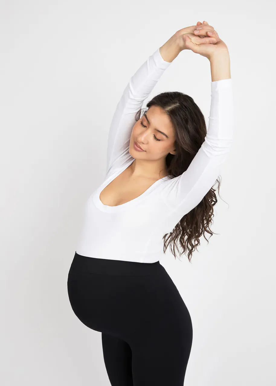 Fabriqué dans un tissu ultra-extensible, le legging épouse chaque courbe de votre corps, du premier mois jusqu’au dernier.