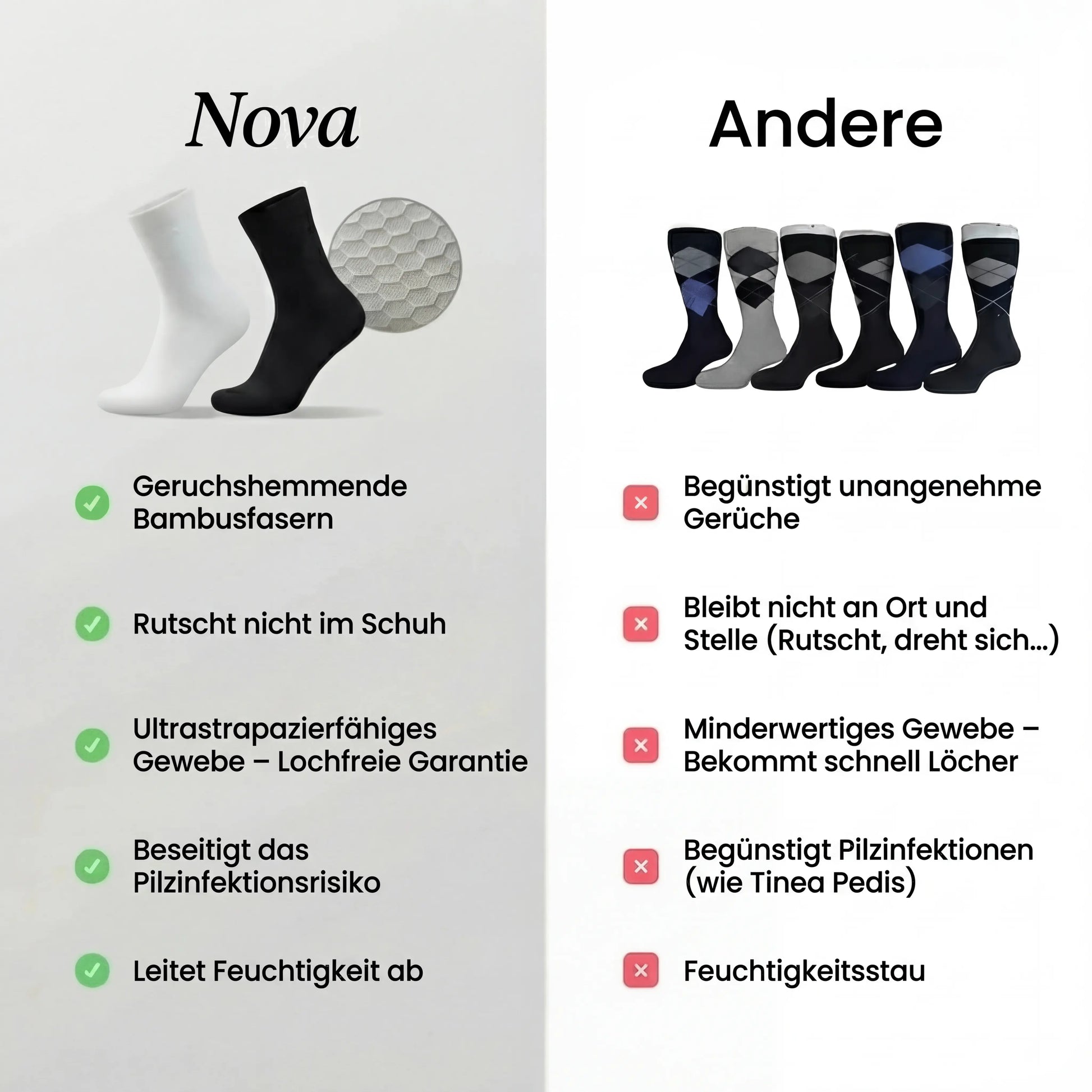 Grâce à un tissu respirant et à la fibre de bambou naturellement antibactérienne, les chaussettes Nova gardent vos pieds secs, du matin au soir sans cette sensation désagréable de chaussettes humides.