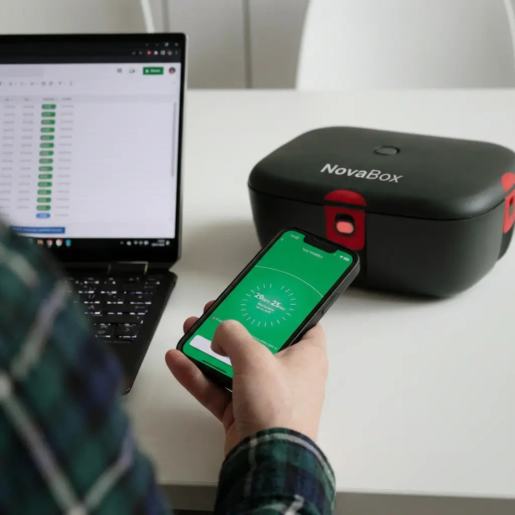 La NovaBox GO peut être facilement rechargée à l'aide d'une banque d'alimentation entre vos repas, car elle ne nécessite qu'un câble USB-C. L'entrée de charge est de 5-15 V et, par conséquent, toutes les banques d'alimentation ordinaires fonctionnent bien.